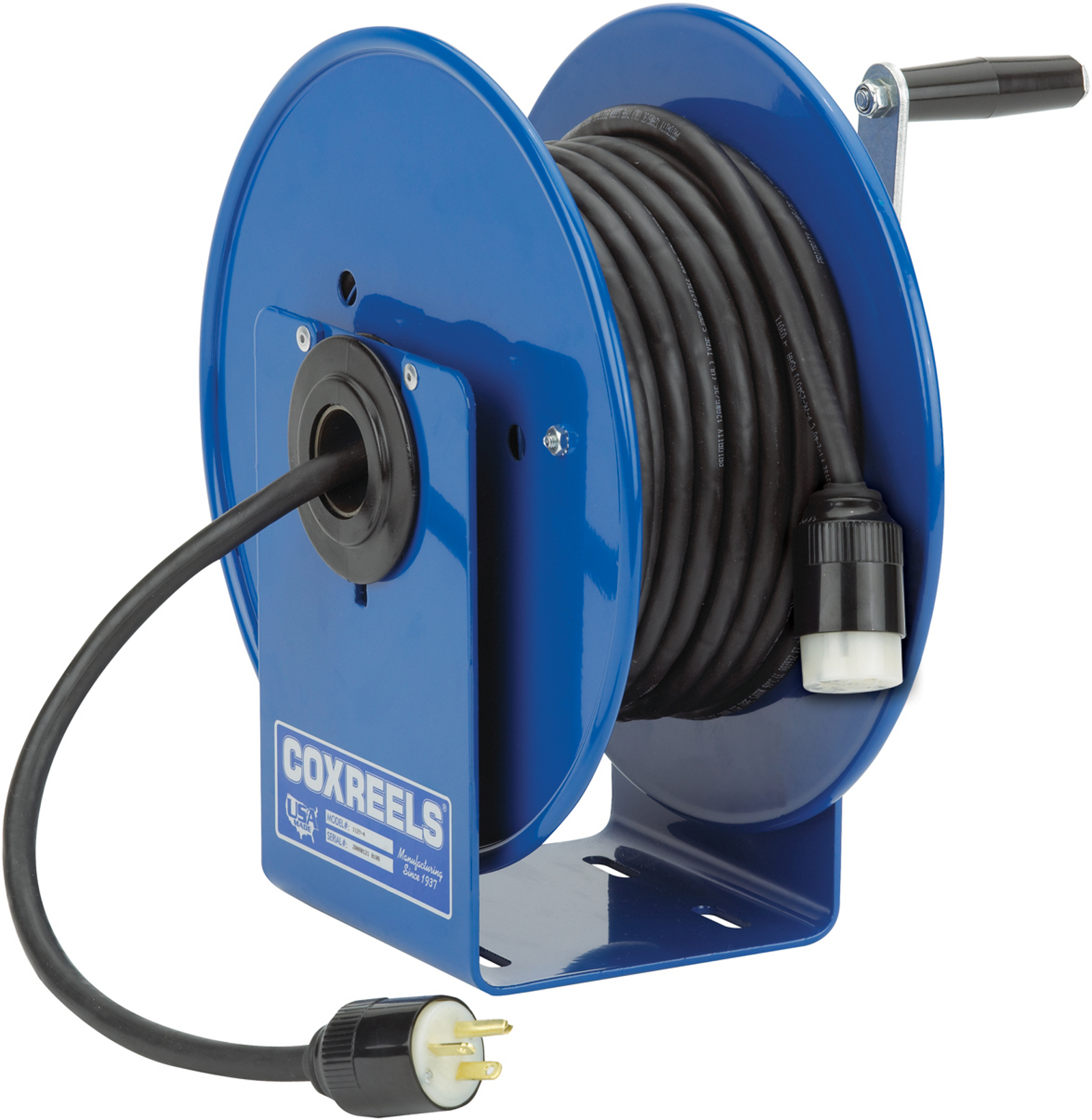 Masterplug heavy duty metal cord reel with 4 120v 15amp integrated outlets and 12 gauge high visibility cord 100ft 4 2 out of 5 stars 101 woods e103 e 103 wheel holds up to 150 16 3 extension 125 feet of 14 3 gauge cord holiday rope hose reel storage and light wire heavy duty plastic red and black.